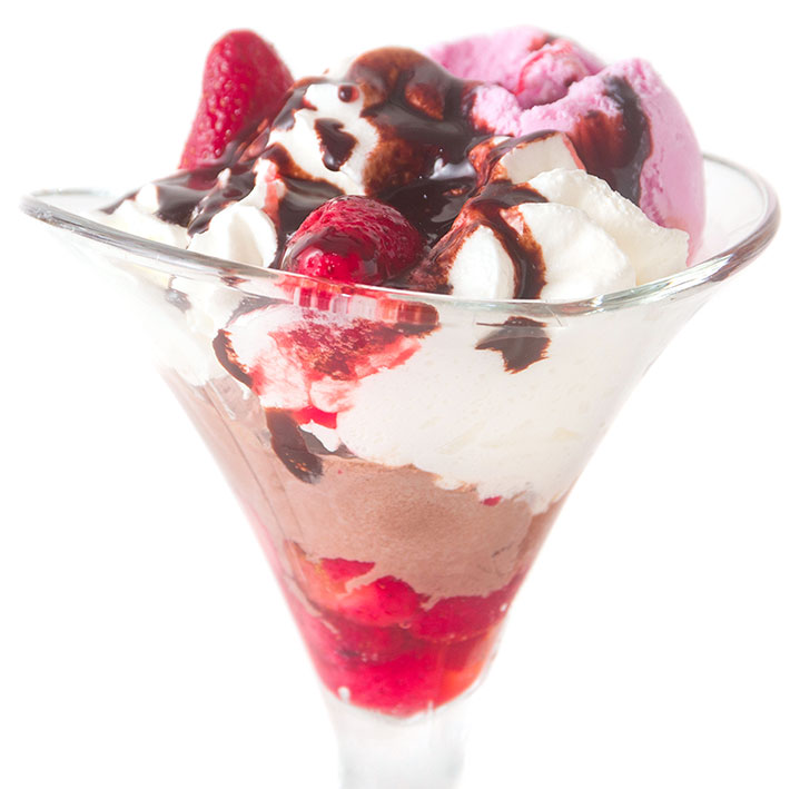 This exquisite creation features a perfect blend of creamy vanilla and rich chocolate ice creams, topping with banana fruit cream and drizzled generously with luscious caramel sauce.