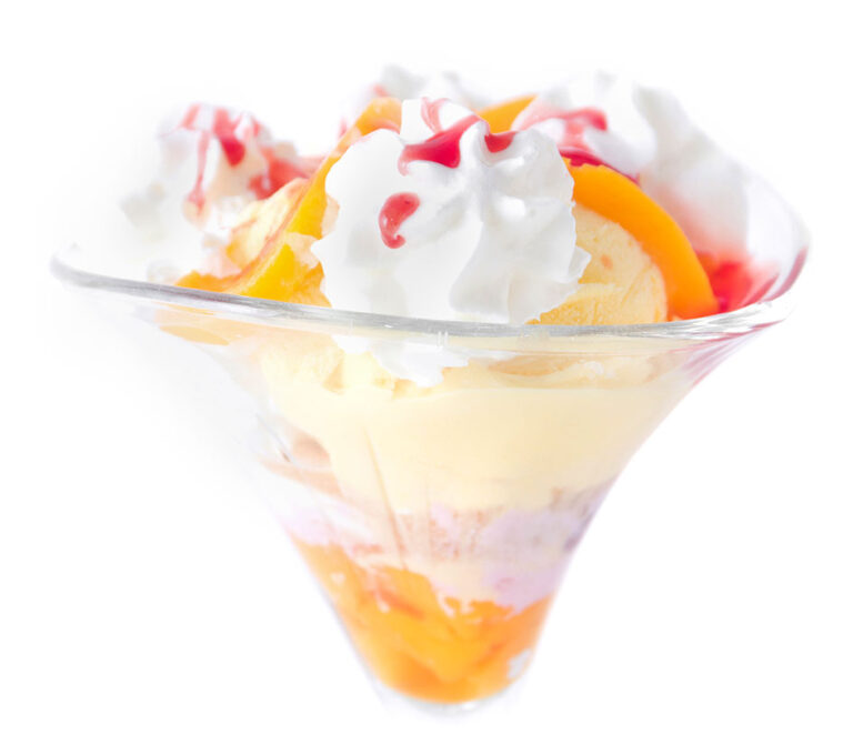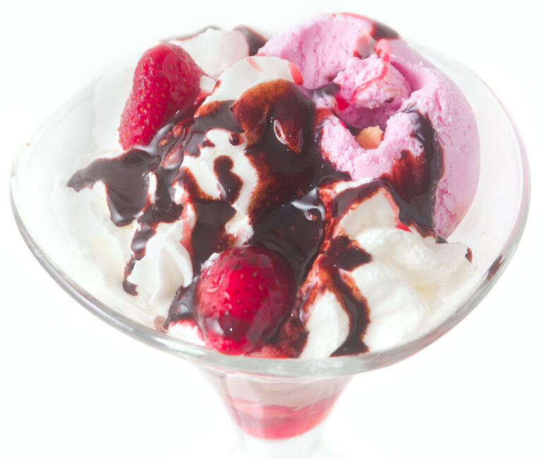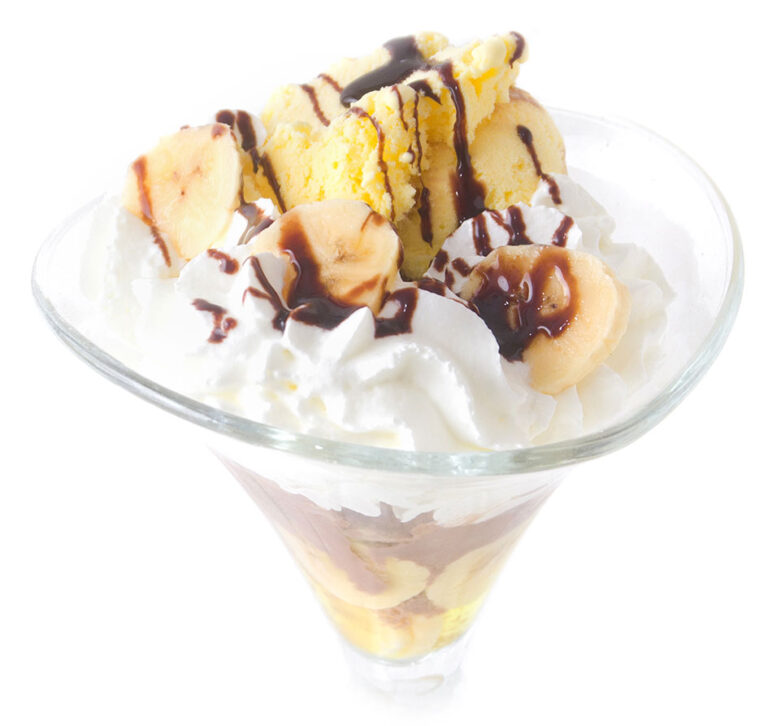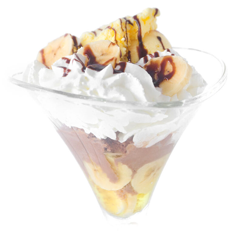 This exquisite creation features a perfect blend of creamy vanilla and rich chocolate ice creams, topping with banana fruit cream and drizzled generously with luscious caramel sauce.