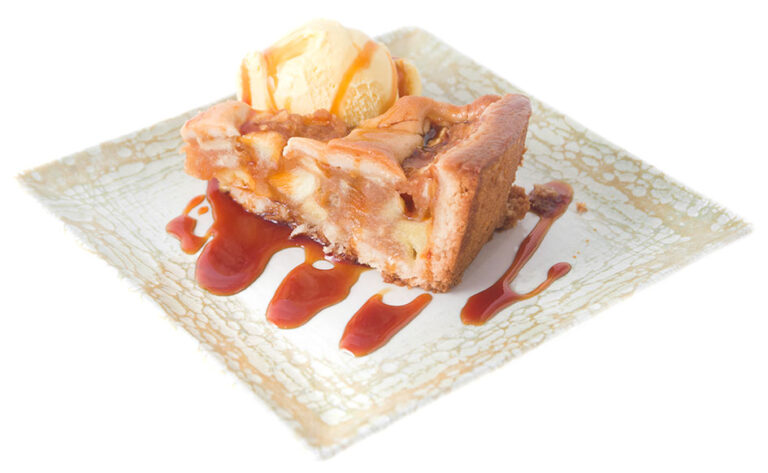 A classic dessert featuring warm apple slices nestled in a flaky pastry crust, served with a drizzle of caramel sauce for a comforting and indulgent treat.